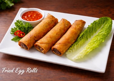 Fried Egg Rolls, golden, crispy rolls filled with seasoned chicken, clear noodles, and fresh vegetables.