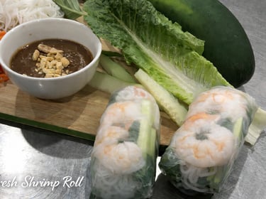 Fresh Shrimp Rolls filled with rice vermicelli, crisp lettuce, cucumber, and fresh herbs, served with peanut sauce.