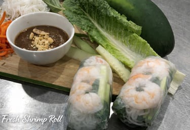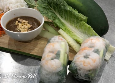 Fresh Shrimp Rolls filled with rice vermicelli, crisp lettuce, cucumber, and fresh herbs, served with peanut sauce.