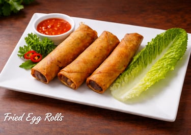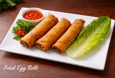 Fried Egg Rolls, golden, crispy rolls filled with seasoned chicken clear noodles, and fresh vegetables.