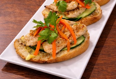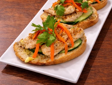 Bánh Mì trio beef, pork, and chicken with chicken pâté, cilantro, and pickled carrot on toasted bread.