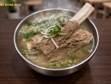 A giant bone-in beef short rib in rich beef broth with fresh flat noodles and herbs. The famous viral Pho taking over TikTok & Instagram.